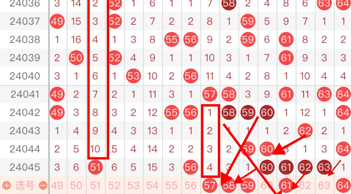 第四区间上期开出了6个号码,60-63这组四连号咱们选中了60 61 63三码,5字头号码依旧是冷态势,本期重心还是在组合号码上,42期开出了55 56和58 59 60组合号码,按照走势来看,5字头号码本期要回补了,那么组合号码可以考虑在57-62之间走出!