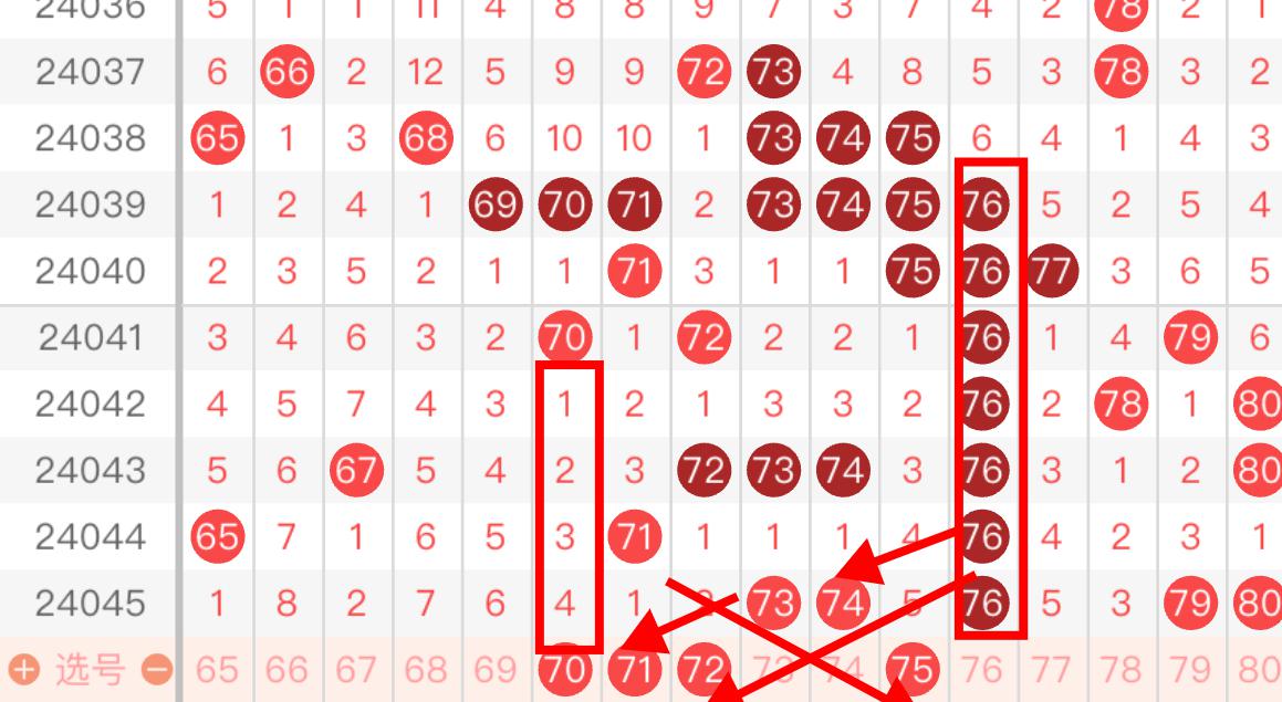 第五区间上期开出了5个号码,74 76 79咱们上期也是稳稳拿捏了,本期依旧是常规走势,号码球数量维持在4码左右,首先呼声最高的76号码球连下7期,快逼近最高记录了,不过本期来看76走势一般,如果要选择的话防守即可,边号75可以参考,另外斜连号码70 71 72走出了双向斜连,本期可以重点参考!