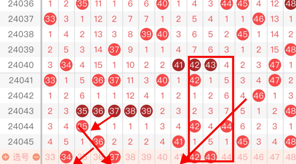 第三区间上期开出了4个号码,属于平稳走势,本期的号码球大概率也会稳定在4-5码,首先可以关注一下斜连走势号码34 37,4字头号码42 44 46走势不错可以参考一下,另外要注意重复号码的隔期回补!