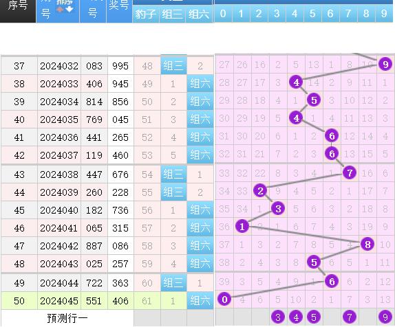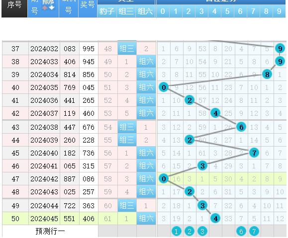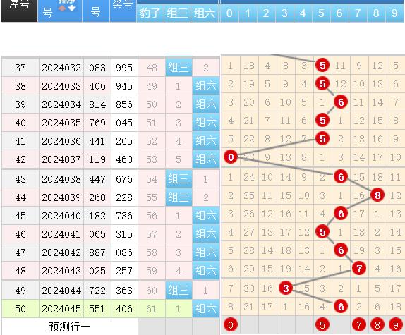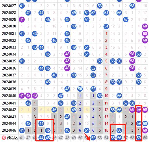 三区间开出了6个奖号(41.45.48.51.56.60)上期回顾三区开出了6个奖号,上期的三区还是呈现了一个继续走热的形态号码落位比较简单,本期我们先来看44.45号球这里的重号加隔期回补走势简单的防守就可以了,52号球是一个边码的回补注意这里的研判上期的(41.45)都是一个边码的回补,再来就是55.56号球是一直都是保持着同出的概率性那么上期的56号球的单落实际上我们可以再隔期防守这个号码本期就防守就号了,59号球这里就是明码上下对称的一个形态码本期能不能给到我们是要进行简单的防守的。