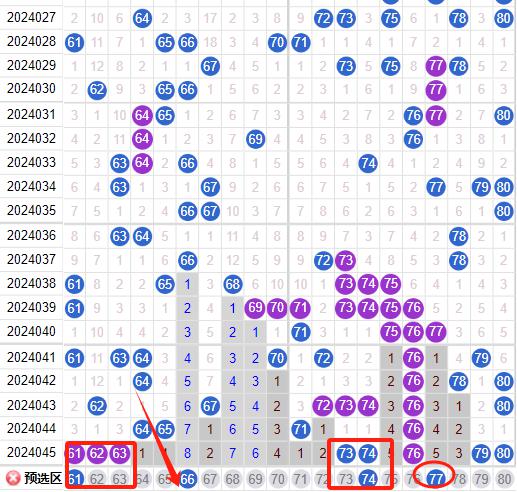 上期四区间开出了8个奖号(61.62.63.73.74.76.79.80)上期的四区开出了8个奖号现在的四区在近五期内是走出了冷热交替的一个形态按照这样的形态本期是有走冷的机会的,我们先来看61号这里的是上期的三连号的重号形态要注意防守,66号球和前几期的(64.65)号球走出了间隔一期的斜连形态注意防守,74号球是一个角号重号的形态那么这里的这个形态是可防守的,77号球这里和39号球之间是有联动关系的注意在本期的一个防守,这个76号还真的是倔犟啊在上期又来了走出了7重号的形态,那么本期的78号球还是要防守的。