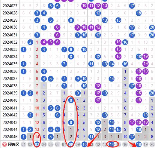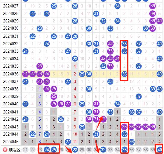 上期二区开出了2奖号(27.36)上期回顾二区开出了2个奖号,上期的27号球是一个形态号码也是上下走势一模一样的走势,那么本期我们看一下这个24号球是一个隔期回补码能不能给到我们要做一个防守,29号球是一个间隔三二二的形态注意防守,32号球是走出与044期的31上下对称的一个形态那么这里能不能想上期的27一样给到我们注意研判,35号球也是我们要防守一个隔期码的回补要是在本期不落位的话我们下期再来防守一期,40号的话有可能走势已经告一段落但是简单的防守还是要做的。