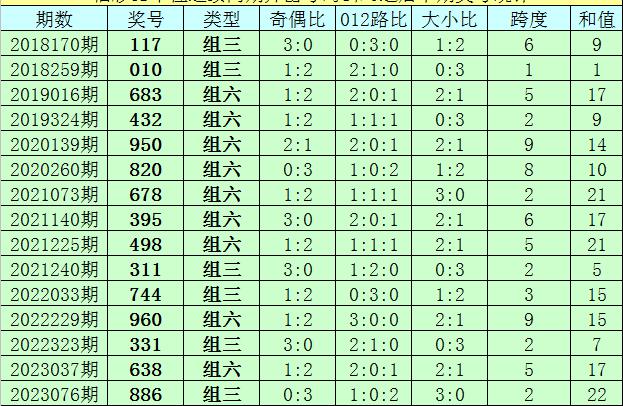 个位号码:最近两期个位开出号码为4-0,在福彩3D历史开奖中,前后两期个位分别开出号码4-0的奖号出现了73次。最近15期个位4-0组合出现之后,其下期奖号分别为:117-010-683-432-950-820-678-395-498-311-744-960-331-638-886;