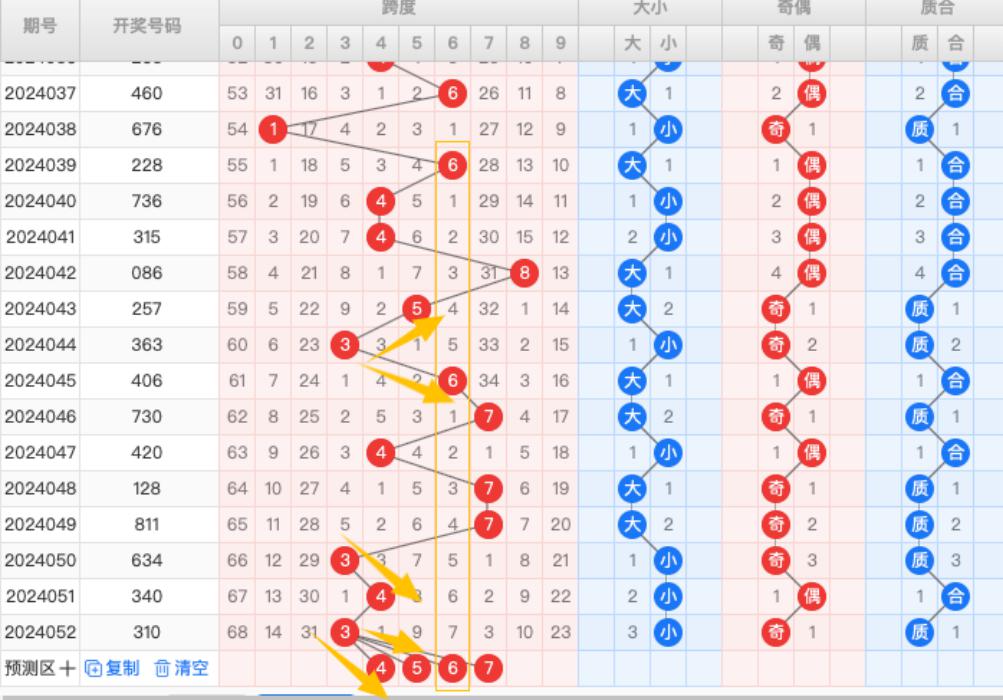 根据走势图分析本期跨度看好4567,重点看45跨。
