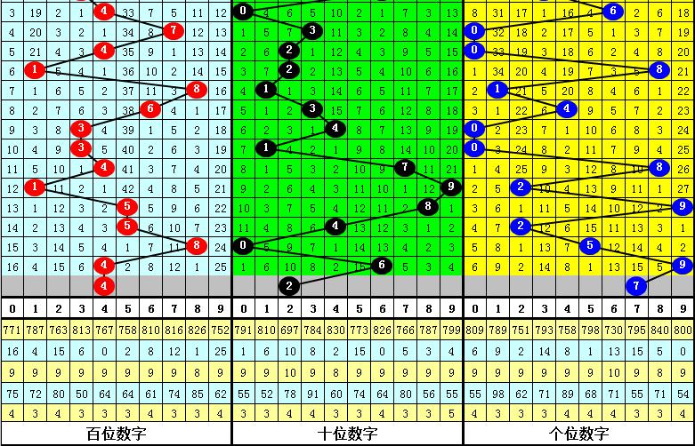 百位分析:百位上期开出号码4,历史上该位号码4出现了767次,最近100期号码4出现次,上期间隔4期再次出现。