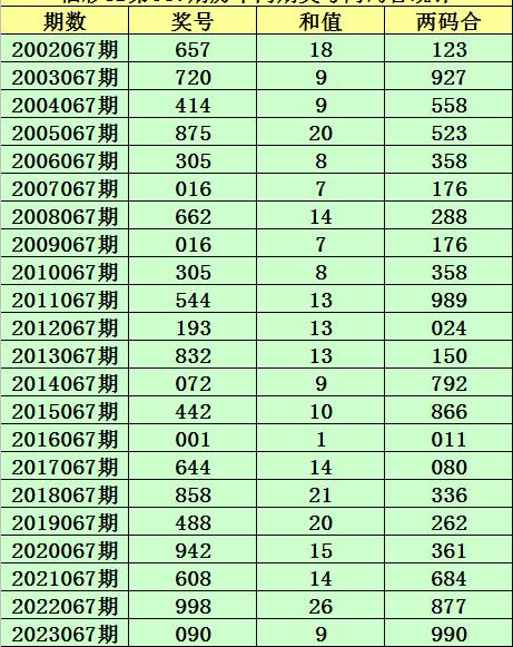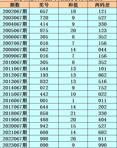 福彩3D第067期,历史上期开出22次奖号,其奖号分别为:657、720、414、875、305、016、662、016、305、544、193、832、072、442、001、644、858、488、942、608、998、090,奖号两码合差分别开出:
