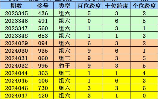 第2024044-第2024046期奖号:363、406、730,其下期奖号为:420,中位号码跨度为3;