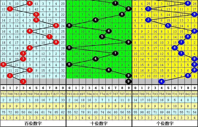 首位跨度分析:首位号码最近3期奖号为0-4-1,连续两期跨度为4、3,历史上首位号码连续两期分别开出跨度4、3的现象共出现171次,其前两次开出奖号分别为: