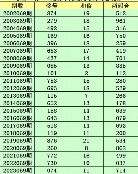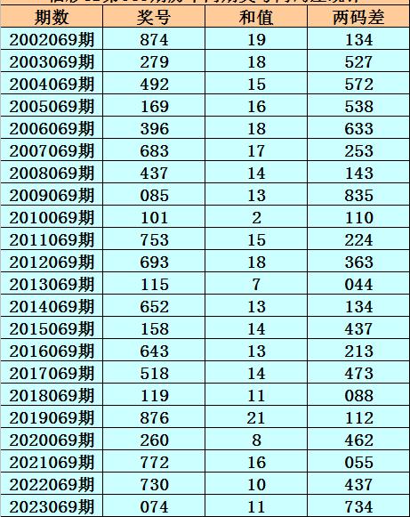 福彩3D第069期,历史上期开出22次奖号,其奖号分别为:874、279、492、169、396、683、437、085、101、753、693、115、652、158、643、518、119、876、260、772、730、074,奖号两码合差分别开出: