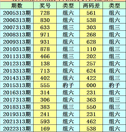 在历年开奖中,两码差开出年限分别为:2出现9年,3、6出现6年,0、5出现5年,1、8出现4年,4出现3年,7出现1年,9出现0年,第2023313期预计两码差出现:2、6、8。
