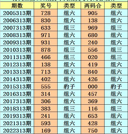 在历年同期中两码合开出年限分别为:0、6出现7年,4出现6年,5出现5年,2、8、9出现4年,1、3出现3年,7出现2年,第2023313期预计两码合出现:0、6、8。