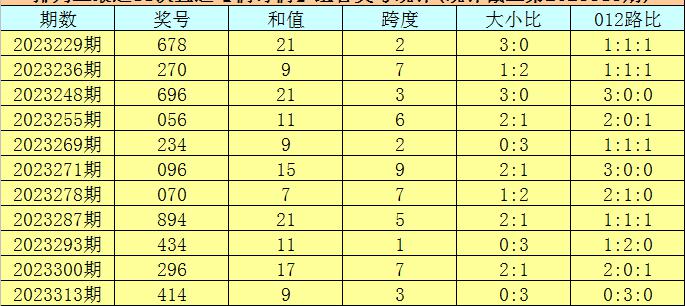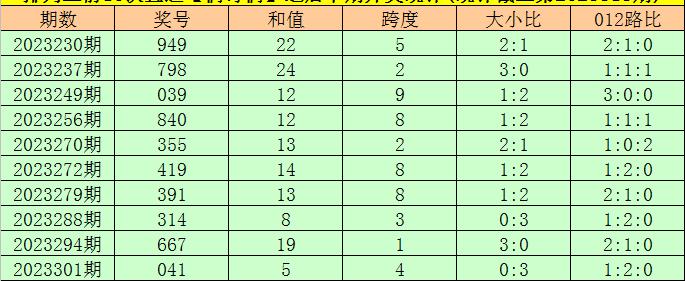 5.下期奖号跨度分别开出:5、2、9、8、2、8、8、3、1、4,其中跨度012路比为2:2:6,大小比5:5,奇偶比为4:6,本期适当关注偶数跨度开出,参考跨度6。