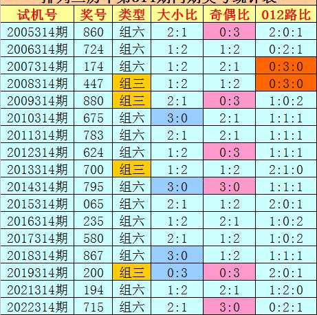 012路分析:历史上排列三第314期同期奖号中,012路奖号总个数比为17:18:16,012路奖号轮空期数比为4:6:4,今年第314期预计2路号码走冷轮空,看好012路比开出2:1:0。