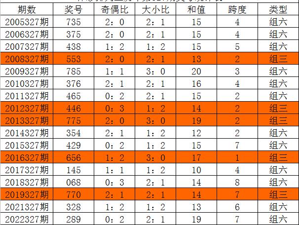 体彩排列三历年第327期开出奖号分别为:735、375、438、553、785、376、465、446、775、354、429、656、145、068、770、328、289。统计详见下表: