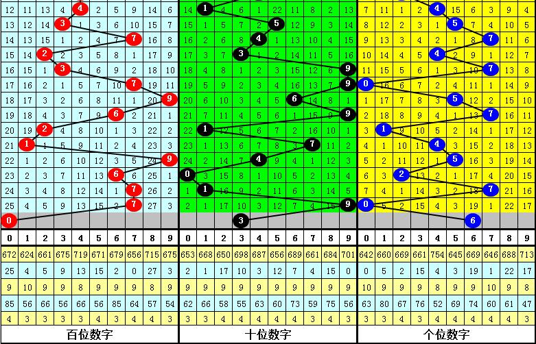 百位分析:该位上期奖号为7,出现1路、奇数、大号,在前11期奖号,该位012路比为5:4:2,2路号码较少,目前012路号码遗漏期数分别为2、0和5,近期百位注意0路号码走热。