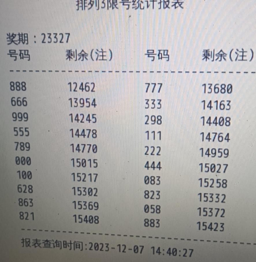 限号表统计报主要是反应当地已选号码最多的20组号码,也反应了当前那一部分太热,一般情况下当期限号表中的直选组合很难开出(豹子除外),也可以用当前限号表排除部分号码,限号表可能不同时间或者不同地区不一样,不过不影响大家看号,可以用这个表分析当前哪些号码热,哪些冷,原则上跟热码防守冷码,大热一般也是开不出来的,所以要冷热结合,偏重选热码,避开选号过热或者过冷。本期限号表去除豹子号,剩下的号码(289,789,001,038,268,238,368,058,128,388)第一组出现的号码就用289(通过多期统计,排序第一的这组号开出胆码的概率高)我们来统计本期多组号码的出次情况号码0;3次号码1;2次号码3;4次号码3;4次号码4;0次号码5;1次号码6;2次号码7;1次号码8;9次号码9;2次出次从大到小排序8320961754前三832,中三0961,后三754。我们可以把这三组号码作为本期热温冷号码。热码:832温码:0961冷码:754经过近几期统计分析,发现一个共同点,限号表出次从大到小排序的后4码出号的概率高,本期以出次后4的号码至少出1码的条件来组号(也就是1754=123)另外就是选用本期单组号码两两组合的二码(28,29,89,78,79,89,00,01,01,03,08,38,26,28,68,23,28,38,36,38,68,05,08,58,12,18,28,38,38,88)在这里我选用这个二码和排序后四码作为胆码进行本期缩水组号。二、选号分析接下来我们来看看当前排列3整体趋势情况