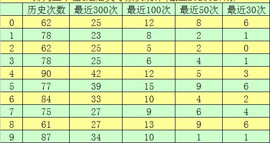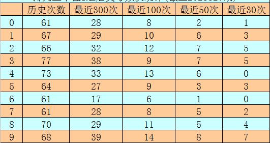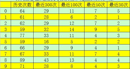 第一位杀号:上期第一位奖号为3,第一位奖号3历史上出现676次,前100次该位开出奖号3之后,下期号码0-9出现次数从高到底分别为:号码3→14次,8→13次,2→12次,0、4、7→11次,6→9次,9→8次,1→6次,5→5次。