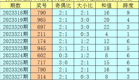 上期回顾:排列三第2023327期奖号:314。类型:组六,奇偶形态:奇奇偶,大小形态:小小小,和值:8,跨度:3。