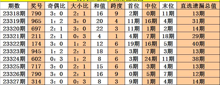 开奖回顾:排列三第2023327期奖号:314,定位直选遗漏值9期、1期、4期,遗漏总值为14期。