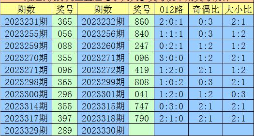 3.在以上9期奖号中,号码012路比分别开出2:0:1、1:1:1、0:2:1、3:0:0、1:2:0、1:0:2、1:2:0、0:3:0、2:1:0,012路出现个数比为11:11:5,本期预计开出012路比1:1:1。