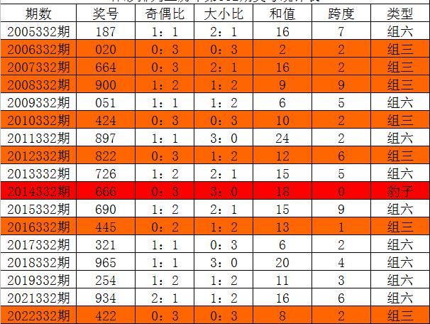 体彩排列三历年第332期开出奖号分别为:187、020、664、900、051、424、897、822、726、666、690、445、321、965、254、934、422。统计详见下表: