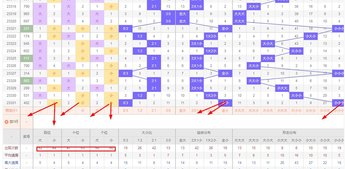 排列三 大小形态分析:从大小走势图上可以看出排列三100期内百位大小比为52比48,十位大小比为47:53,个位大小比为50比50,除了十位小数比大数多,百位和个位都是大数比小数多。历史数据近期开出小小小后下一期的走势为第282期开出小小小 后下一期走小小大,第297期开小小小 后下一期走大小大,第306期期开出小小小后第307期走大大大形态。 可以看出开出大大小 形态后形态转变过快,不过还是能看出开出小大大形态后下一期喜大数,这时遗漏数据就显示作用的时候了,结合遗漏数据再加上开出小小小 形态后喜出大数所以排列三第332期大小形态推荐大大小或大小小防全大。