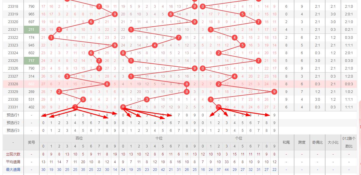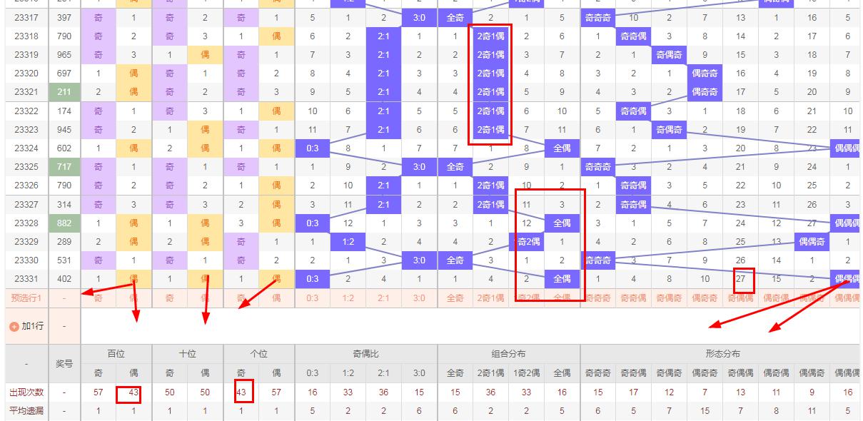 排列三 奇偶分析:从上图可以看出排列三100期内百位奇偶比为57比43,十位奇偶比为50比50,个位奇偶比为43比57.十位的比值比较均衡,但是百位和个位的比值偏差就有点大,历史奇偶形态走势数据开出偶偶奇后下期的走势为,第312期开出偶偶偶后313期开出偶奇偶走势,第324期开出偶偶偶 后325期开出奇奇走奇势。328期开出偶偶偶 后329期的走势为偶偶奇。本期应该注意奇偶偶或奇偶奇所以排列三第2023332期奇偶形态推荐奇奇偶,奇偶奇形态防守奇偶偶