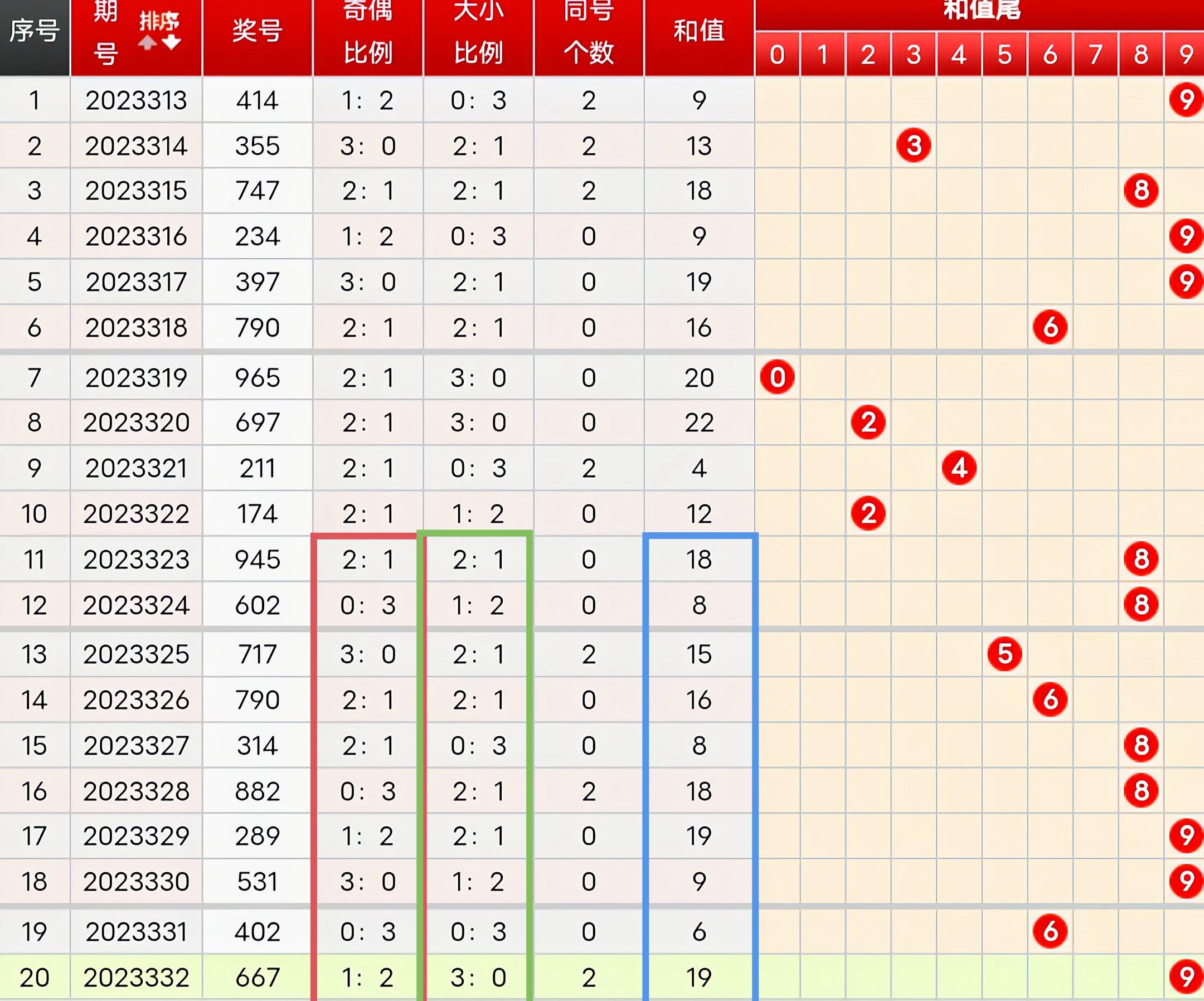 大小比例:上期大小比为3:0,从近20期大小比例可以看出一般大小比3:0开出后会开大小比0:3或2:1,但是近期已开出大小比0:3,因此大概率不会再开出;故本期大小比例参考大小比2:1,防1:2。同号分析:从上图可以看出,上期开出同号6。近20期同号出现频率较少,故本期大概率不会开出同号。和值分析:从上图可以看出,上期和值为19;近10期和值分别为18 8 15 16 8 18 19 9 6 19。近10期和值走势分别为:升降升升降升升降降升。从近20期可以看出和值在4-22区间比较常见,其中在18-20区间中最为活跃;近10期和值的平均值为13.6,其中有6期高于平均值,上期数据显示和值高于平均值,结合升降走势本期和值应该不会上升,推荐和值下降。 >