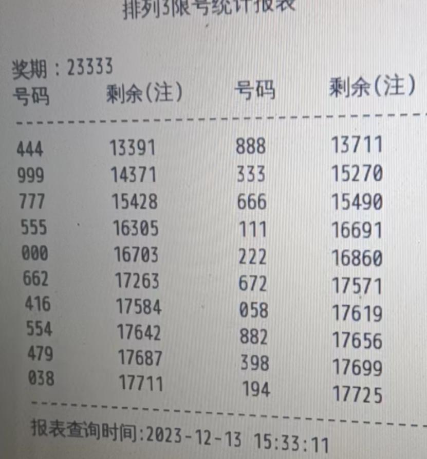 用100期的数据来看吧,趋势上行,当前遗漏1期,本期关注,关注01,防3排列3本期看好012549=23(至少出现2码),防3678=01(最多出现1码),这个条件灵活运用,我一般会考虑在精选号码时使用。三、2023333期组号独胆2双胆23三胆237六码237458大底组号条件5310=123;06719=123;012479=123;2378=123(组号条件看不懂的可以看文章首部说明,或者留言交流)017 025 026 027 028 035 037 047 057 067 078 079 125 126 127 128 135 136 137 138 147 157 167 178 179 236 237 256 257 259 347 357 359 367 378 379 457 567 578 579(40注)精选21注026 028 047 067 079 126 127 128 136 138 167 179 236 237 256 347 359 367 378 379 579综合各指标分析,小防组三开出。002 003 007 022 033 077 112 113 117 118 122 133 177 188 225 226 227 255 266 277 337 377 447 477 557 577 667 677 778 779 788 799(32注 )以上是本期个人的分析,仅供大家参考,并请保持理性。路过的友友,我个人很用心的看号,对这个分析我自身花时间花精力研究,如果你觉得有用,麻烦点下方红色按钮给以鼓励,或点击上方“关注”,你的支持是我创作的动力。谢谢。|