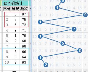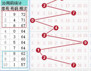 上期第三位开出7,历史数据中第三位为7之后开出的号码频次如图左所示,第三位近期走势图如图右所示:
