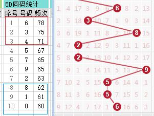 上期第五位开出6,历史数据中第五位为6之后开出的号码频次如图左所示,第五位近期走势图如图右所示: