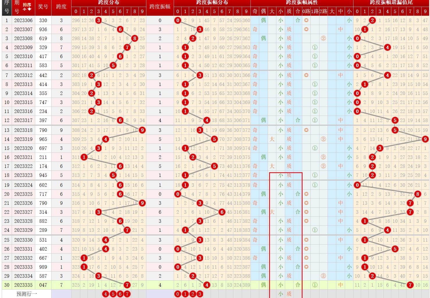 从跨度振幅大小属性来看,近10期内小数容易连开,上期开出了小数,本期大概率仍会开出小数;故本期跨度振幅应该为小数号码。符合条件的为0-1-2-3;通过跨度振幅计算,本期跨度可能为4-5-6-7。