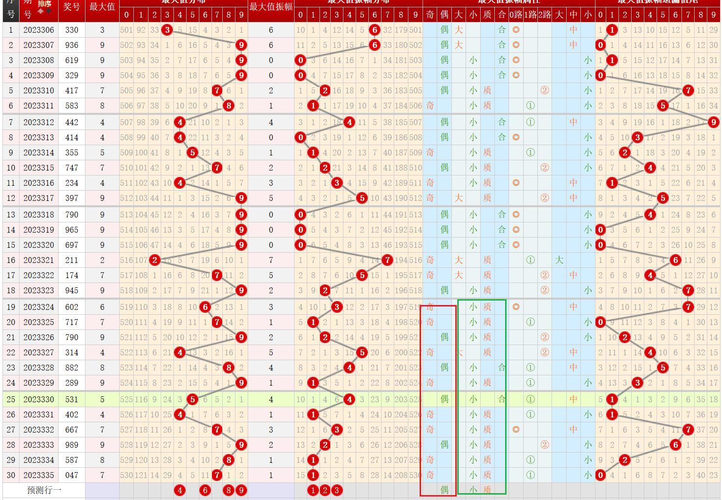 上一期最大值开出号码为7,为奇数、大数、质数、1路号码。通过观察上图最大值振幅属性走势: