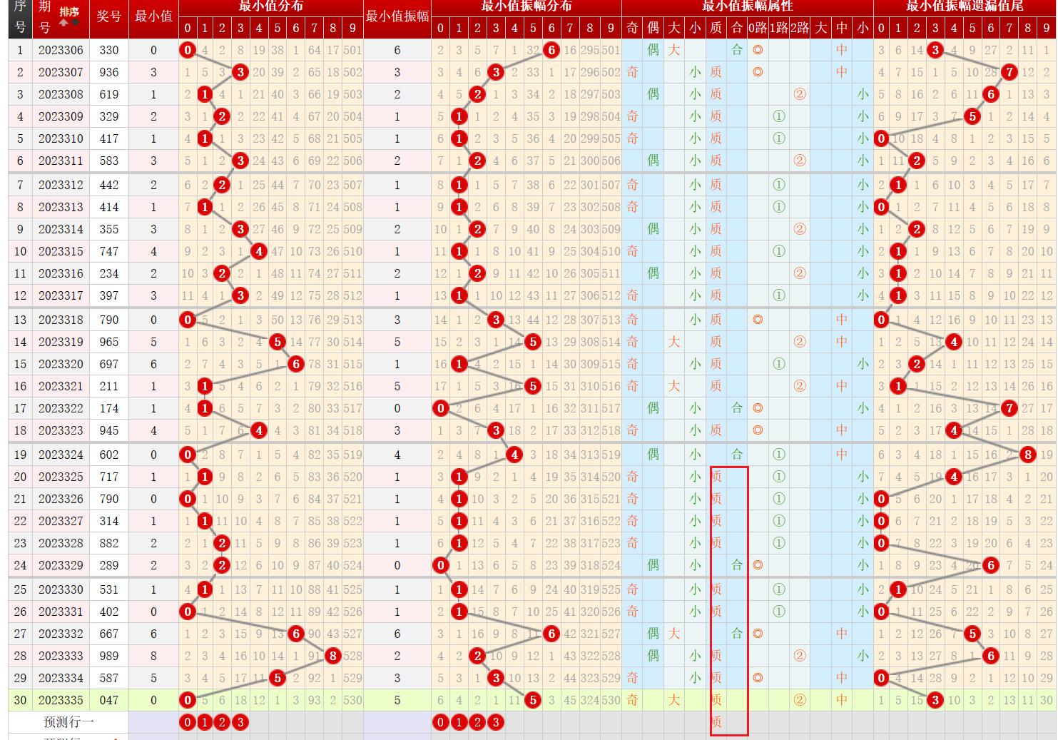 上一期最小值开出号码为0,为偶数、小数、合数、0路号码。下面先通过振幅走势来判断振幅取值范围: