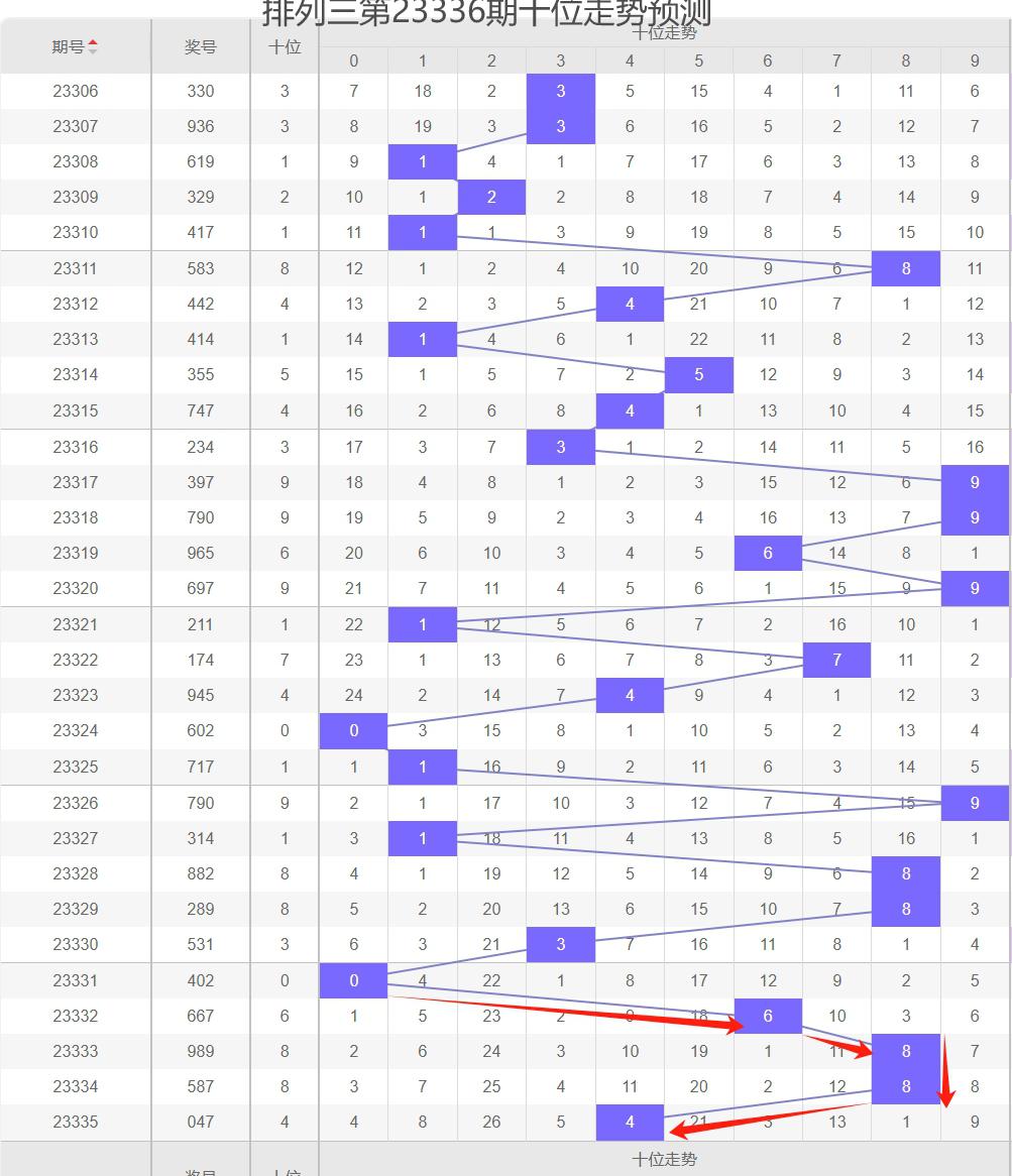 百位数字从第23331期至第23333期,已连续3期未出在质数上,第23334期质数回补,上期合数出现,且数字回落到最低点,属于小数回补及遗漏号码回补。本期继续关注小数