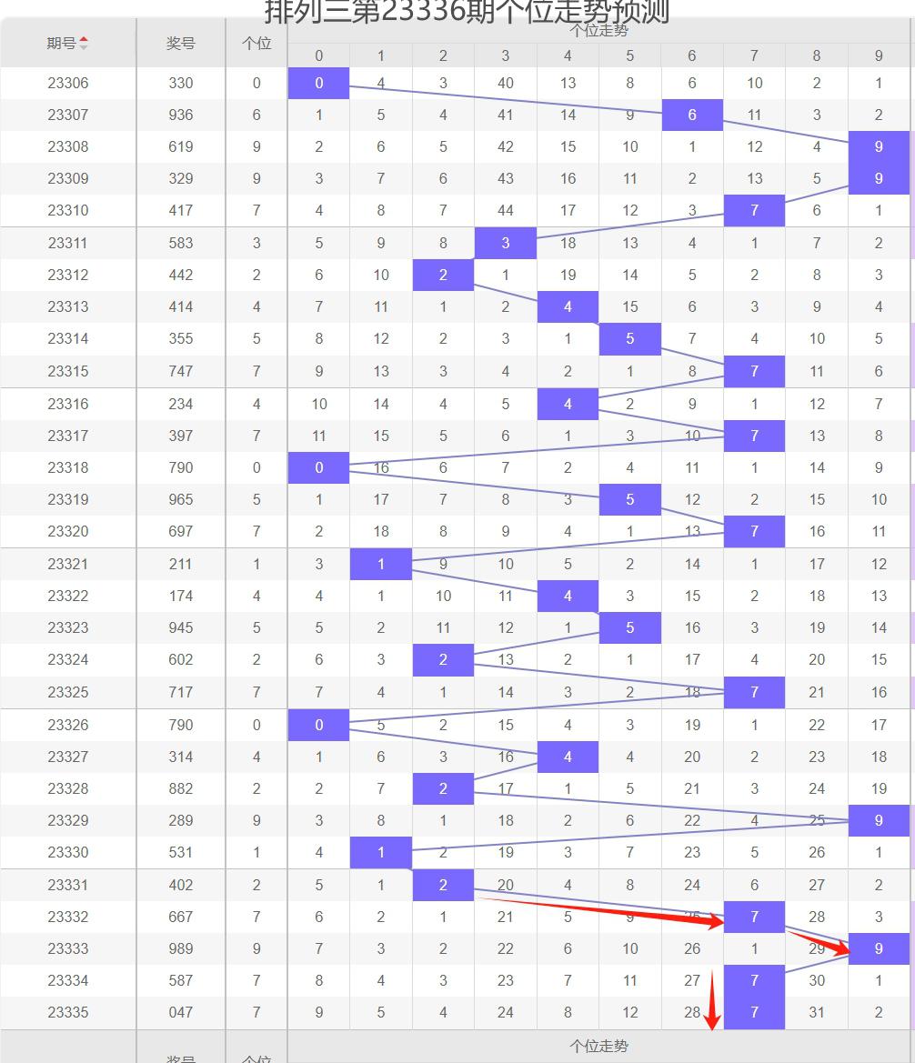 排列三近十期个位数字为0-4-2-9-1-2-7-9-7-7,数字分布在7、9范围内,该范围内缺失3-5-6-8。