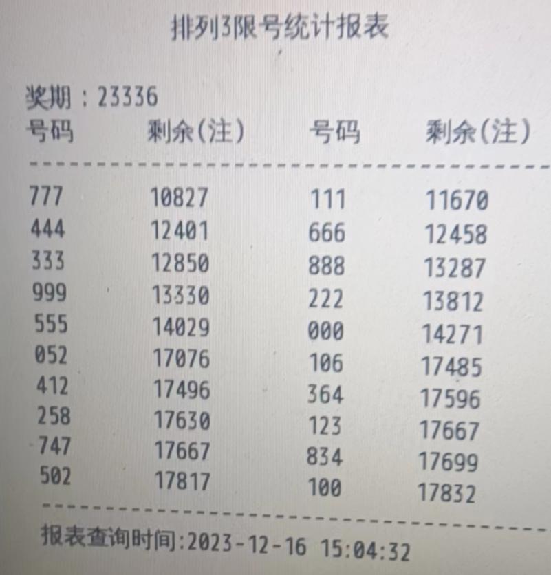 限号表统计报主要是反应当地已选号码最多的20组号码,也反应了当前那一部分太热,一般情况下当期限号表中的直选组合很难开出(豹子除外),也可以用当前限号表排除部分号码,限号表可能不同时间或者不同地区不一样,不过不影响大家看号,可以用这个表分析当前哪些号码热,哪些冷,原则上跟热码防守冷码,大热一般也是开不出来的,所以要冷热结合,偏重选热码,避开选号过热或者过冷。本期限号表去除豹子号,剩下的号码(025,016,124,346,258,123,477,348,001)第一组出现的号码就用025(通过多期统计,排序第一的这组号开出胆码的概率高)我们来统计本期多组号码的出次情况号码0;3次号码1;4次号码3;4次号码3;3次号码4;4次号码5;2次号码6;2次号码7;1次号码8;2次号码9;0次出次从大到小排序4213086579前三421,中三3086,后三579。我们可以把这三组号码作为本期热温冷号码。热码:421温码:3086冷码:579经过近几期统计分析,发现一个共同点,限号表出次从大到小排序的后4码出号的概率高,本期以出次后4的号码至少出1码的条件来组号(也就是6579=123)另外就是选用本期单组号码两两组合的二码(02,05,25,01,06,16,12,14,24,34,36,46,25,28,58,12,13,23,47,47,77,34,38,48,00,01,01)在这里我选用这个二码和排序后四码作为胆码进行本期缩水组号。二、选号分析接下来我们来看看当前排列3整体趋势情况