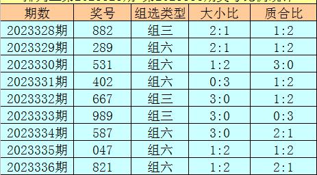 上期回顾:排列三第2023336奖号开出821,奖号质合比为2:1,大小比为1:2,跨度为7,类型为组六。