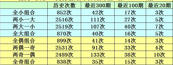 连续10期奖号中,全小形态开出2期,两小一大形态开出3期,两大一小形态开出2期,全大形态开出3期,本期大小形态判断:两小一大奖号。