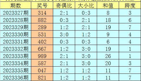 上期回顾:排列三第2023336期奖号:821。类型:组六,奇偶形态:偶偶奇,大小形态:大小小,和值:11,跨度:7。