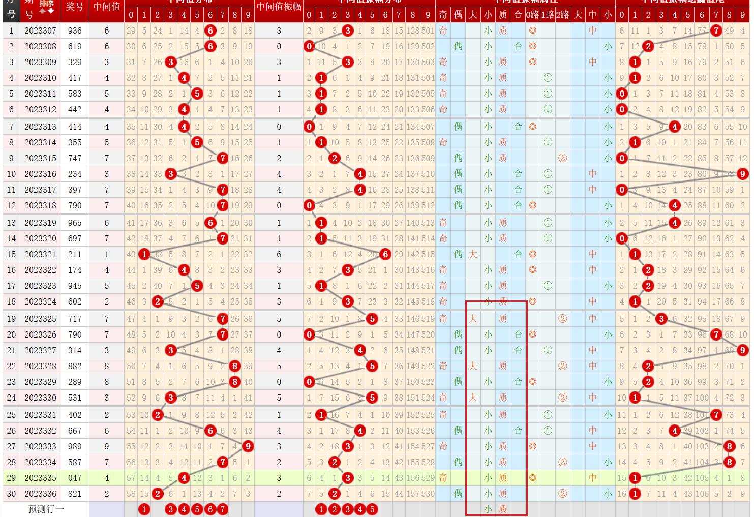 从中间值振幅大小属性来看,近10期内小数连开趋势强,本期仍可能延续连开趋势;从质数属性来看近10期内质数容易连开,上期开出了质数,本期应该仍会开出质数;故本期中间值振幅应该为小数、质数号码;符合条件有1-2-3,防4-5,通过中间值振幅计算,本期中间值可能为1-3-4-5-6-7。