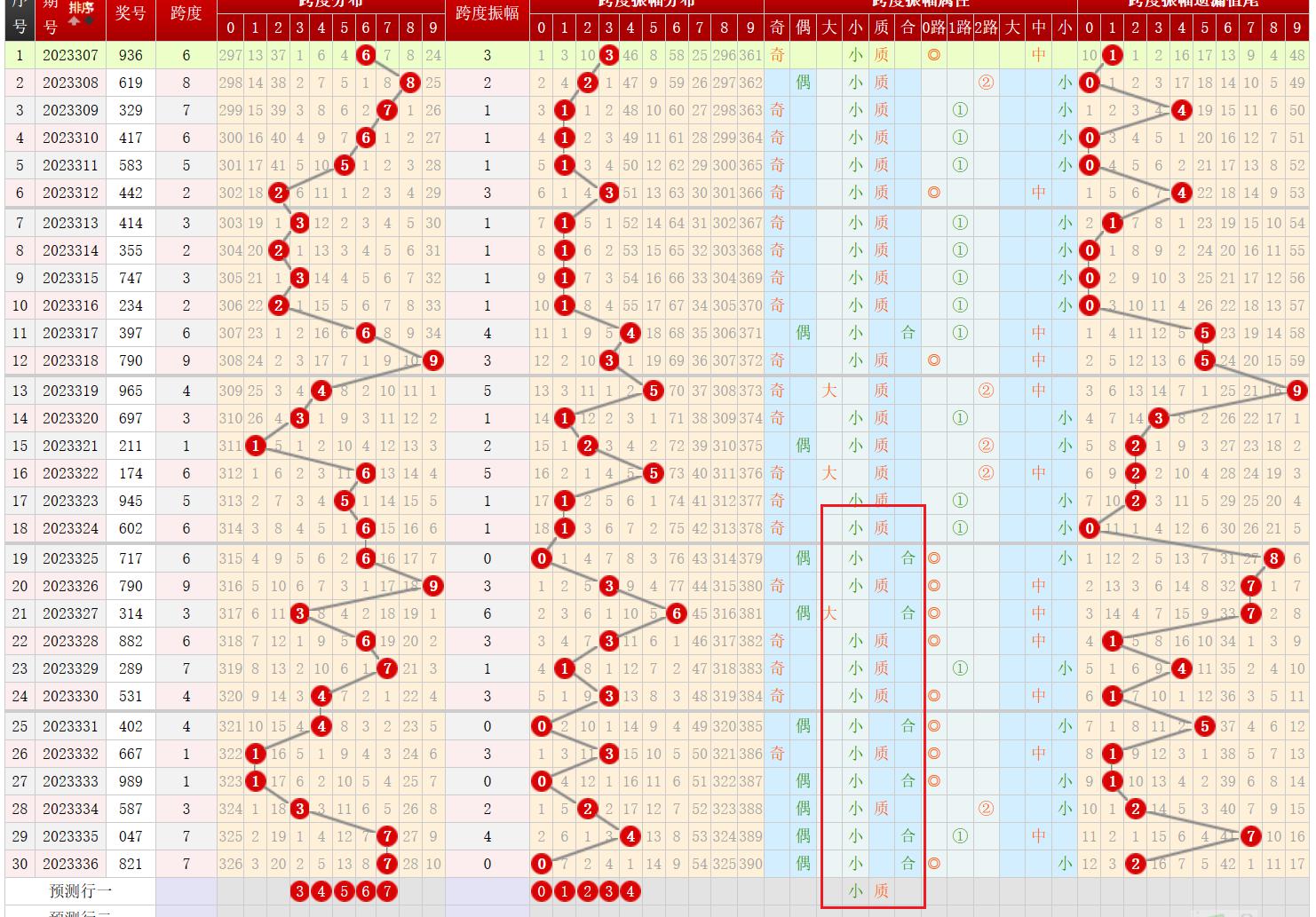 从跨度振幅大小属性来看,近10期内小数出号9期,小数号码热开,本期仍看好小数出号;故本期跨度振幅应该主要考虑小数号码。符合条件的为0-1-2-3-4;通过跨度振幅计算,本期跨度可能为3-4-5-6-7。