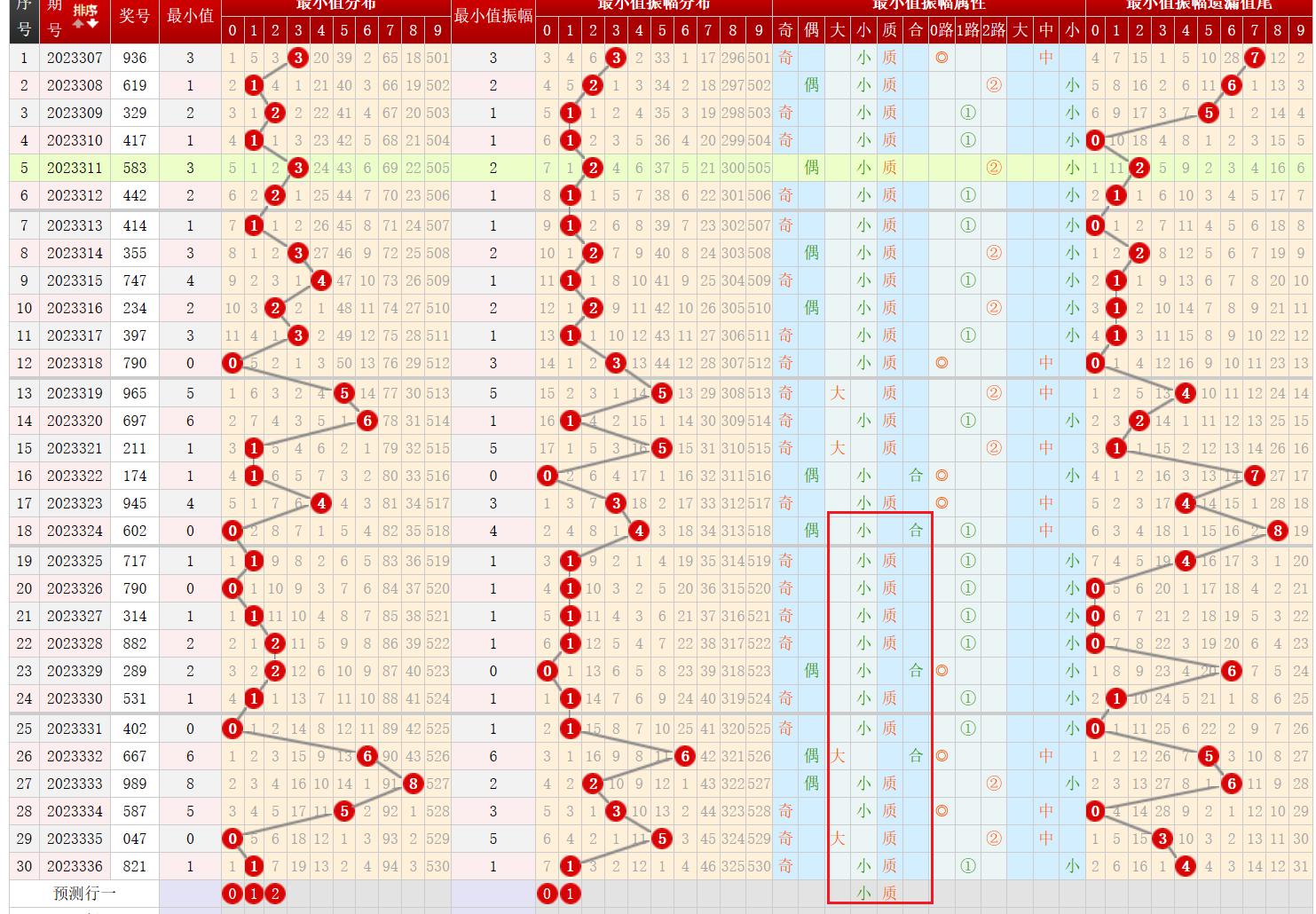 从最小值振幅质合属性来看,近10期内质数出号8期、合数出号2期,质数更容易出号;从大小属性来看,近10期内小数容易连开,上期开出了小数,本期应该仍会开出小数;故本期最小值振幅应该小数、质数号码,则符合条件为1,防0;通过振幅计算,本期最小值可能为0-1-2。