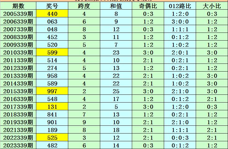 上期回顾:排列三第2023339期奖号为482,组选类型为组六,奖号大小比为1:2,012路比为0:1:2,奇偶比为0:3。