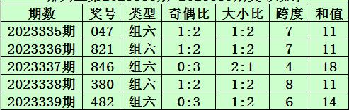 上期回顾:排列三第2023339期开奖号码为482。奖号类型为组六,奇偶比为0:3,大小比为1:2,跨度为6,和值为14。