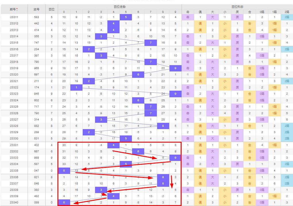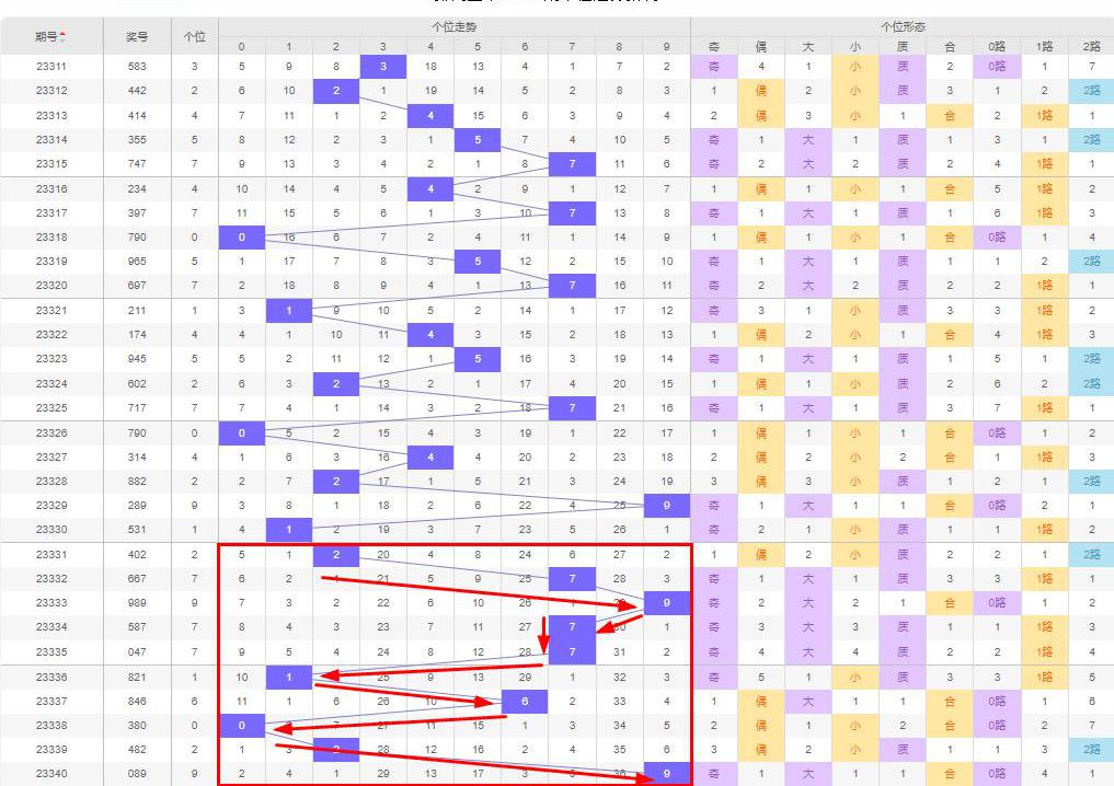 从走势上来说,个位数字从第23338期(0)开始向上走,直到上期(第23340期)个位数字走到9,即0↑2↑9(-/↓),且不排除本期9直落的可能性,即本期百位数字可能为0-9。