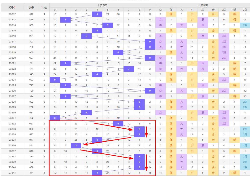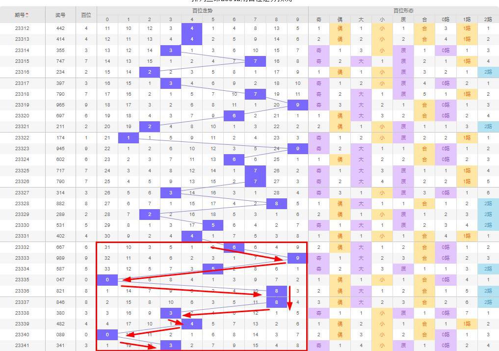 从走势上来说,百位数字第23337期开始一期下落一期上升的趋势,直到上期(第23341期)百位数字上升到8↓3↑4↓0↑3(-/↓),按照百位数字近几期走势来看,本期百位数字直落或者向下走,即本期百位为0-3。