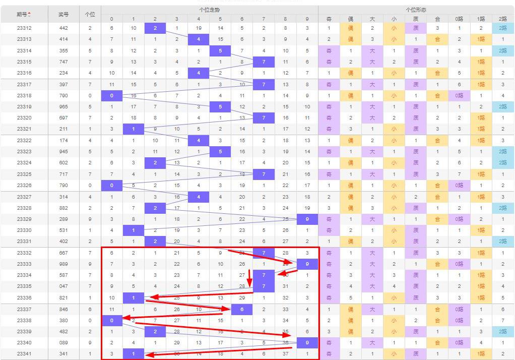 从走势上来说,个位数字从第23338期(0)开始向上走,向上走两期后回落,上期(第23341期)第一次回落到1,即0↑2↑9↓1(-/↓),按照这个趋势,本期个位数字可能为0-1。
