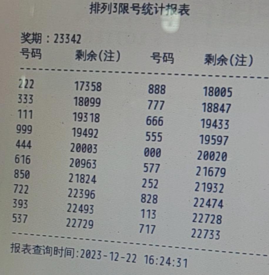 用100期的数据来看吧,趋势上行,当前连开5期,本期关注,关注06,防4排列3本期看好061957=23(至少出现2码),防4283=01(最多出现1码),这个条件灵活运用,我一般会考虑在精选号码时使用。三、2023342期组号独胆0双胆05三胆059六码059827大底组号条件9604=123;01489=123;012478=123;1346789=123(组号条件看不懂的可以看文章首部说明,或者留言交流)012 015 017 018 019 024 027 028 029 038 039 045 047 048 049 056 057 058 059 068 069 078 079 089 159 245 249 259 279 289 389 457 458 459 479 489 579 589(38注)精选23注015 017 019 024 028 039 045 047 056 059 079 159 245 249 259 279 289 389 458 459 479 579 589综合各指标分析,小防组三开出。001 002 004 005 007 008 009 022 055 077 088 099 199 224 399 455 477 499 557 559 577 599 779 799 889 899(26注 )以上是本期个人的分析,仅供大家参考,并请保持理性。路过的友友,我个人很用心的看号,对这个分析我自身花时间花精力研究,如果你觉得有用,麻烦点下方红色按钮给以鼓励,或点击上方“关注”,你的支持是我创作的动力。谢谢。上一篇:23342期排列三 试机号924