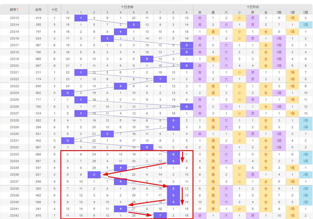 十位数字从第23333期至第23342期,已连续10期未出在0路号上,已经达到30期内、50期内、100期内0路号最大遗漏次数,本期十位数字出0路号的概率很大。